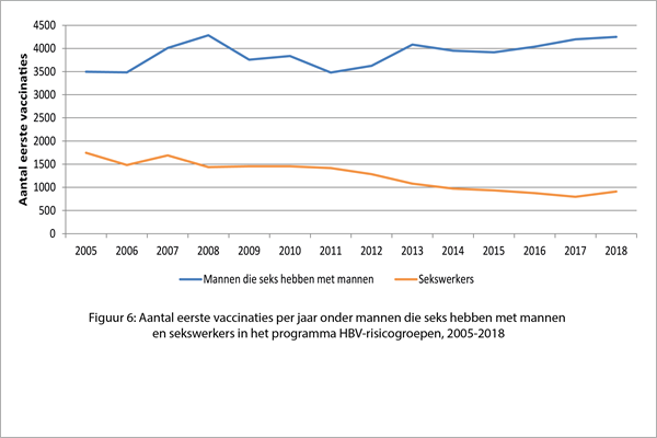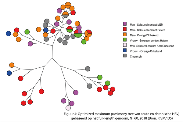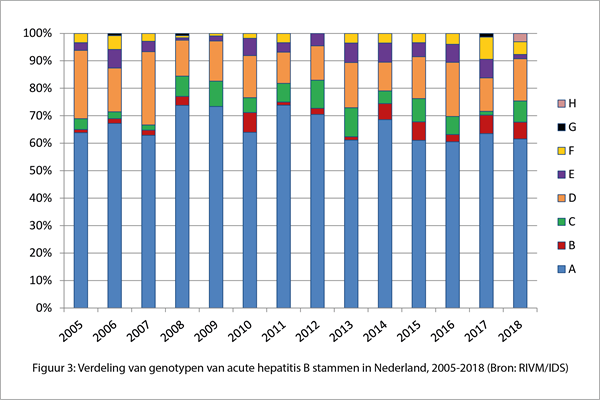 | Hepatitis jaaroverzicht Deze nieuwsbrief is verstuurd naar de afdelingen infectieziekten van de GGD en naar de contactpersonen bij de laboratoria. Wij willen u vragen de nieuwsbrief door te sturen naar degenen binnen uw organisatie die zich bezig houden met hepatitis B en C. U kunt zich aanmelden voor de nieuwsbrief via abonneren.rivm.nl. Afmelden kan via de link onderaan deze nieuwsbrief. | | | Dit jaaroverzicht is gebaseerd op informatie die bij RIVM beschikbaar is uit de volgende bronnen: - Wettelijke meldingen van nieuwe hepatitis B en C virus infecties (OSIRIS), inclusief de moleculaire surveillance van acute hepatitis B virus infecties - Bevolkingsonderzoek zwangeren (PSIE: Prenatale Screening infectieziekten en Erytrocytenimmunisatie) - Rijksvaccinatieprogramma (RVP) - HBV vaccinatieprogramma voor risicogroepen | Introductie meldingsplicht chronische hepatitis C | | Per 1 januari 2019 is de meldingsplicht voor hepatitis C veranderd. Naast acute hepatitis C zijn nu ook chronische infectie en herinfectie met hepatitis C-virus meldingsplichtig voor behandelend artsen en hoofden van microbiologische laboratoria. Hiertoe is besloten omdat er sinds 2015 een nieuwe effectieve behandelmethode voor chronische HCV is die ook vanuit het basispakket vergoed wordt. Deze behandelmethode draagt bij aan de genezing en het voorkomen van chronische HCV. Het heeft daarmee meerwaarde om alle geïnfecteerde personen tijdig in beeld te krijgen en te behandelen om zo verdere verspreiding te voorkomen. De huidige meldingsplicht voor alleen acute HCV-infecties voorziet hierin onvoldoende. De GGD kan in geval van een brede meldingsplicht de contact- en bronopsporing uitvoeren, alsook de begeleiding van patiënten naar de tweede lijn. De meldingsplicht houdt in dat alle personen die voldoen aan de meldingscriteria voor een recente primo HCV-infectie, een chronische HCV-infectie/infectie met onbekende duur of een HCV-herinfectie binnen één werkdag na vaststelling door het hoofd van het laboratorium en de behandelende arts gemeld worden aan de arts infectieziektebestrijding van de GGD in zijn/haar werkgebied. De GGD meldt vervolgens conform de Wet publieke gezondheid aan het RIVM en levert gegevens voor de landelijke surveillance van meldingsplichtige ziekten. | Herziening richtlijn hepatitis C | | De HCV-richtlijn van de LCI is onlangs goedgekeurd door het Landelijk Overleg infectieziektebestrijding (LOI) en inmiddels staat de definitieve versie op de website. De richtlijn is geactualiseerd op alle onderdelen, met name epidemiologie en behandeling. Daarnaast zijn natuurlijk ook de nieuwe meldingscriteria opgenomen. Zie voor de richtlijn: https://lci.rivm.nl/richtlijnen/hepatitis-c | Financiering regionale netwerk projecten GGD | | In het Nationaal Hepatitisplan (2016) staat beschreven dat de zorg rondom hepatitis beter georganiseerd kan worden. In de zorg rondom hepatitis zijn veel verschillende disciplines betrokken (denk aan microbiologen, GGD-zorgprofessionals, hepatitiscentra, huisartsen, verloskundigen, verslavingszorg etc.) waardoor het verlenen van de juiste zorg complex is en het belangrijk is dat men regionaal afspraken maakt over de zorg. Om de GGD’en te stimuleren om een netwerkstructuur op te bouwen, kon er in 2018 bij wijze van pilot een projectaanvraag bij het RIVM ingediend worden. De volgende projecten zijn eind 2018, begin 2019 gestart en zullen ongeveer 2 jaar in beslag nemen. Na 1 jaar volgt een tussentijdse evaluatie. - Reeds bestaande globale hepatitisnetwerkstructuur verstevigen en formaliseren waardoor het actieplan HBV en HCV preventie en zorg worden geborgd. Hierbij is aandacht voor opsporing van personen met een ongediagnosticeerde infectie, heropsporing en het uittekenen (en verbeteren) van patiënt zorgpaden in de zorgketen - Netwerkstructuur uitbreiden en bestendigen voor de moeilijker benaderbare patiënten, waarbij een persoonlijke benadering van zowel patiënten als zorgverleners centraal staat. - De opgedane kennis en ervaring rondom zorg voor en communicatie met vluchtelingen en laaggeletterden inzetten om de hepatitiszorg voor vluchtelingen te verbeteren. - Verbetering van de ketenzorg voor zwangere vrouwen met HBV en HCV. - Knelpuntenanalyse van de ketenzorg in de regio. - Het actief betrekken van huisartsen en inzet praktijkondersteuners bij ketenzorg. - Netwerkstructuur rondom eerste generatie migranten opbouwen. | Meldingen hepatitis B virus infecties | | In 2018 werden 104 gevallen van acute hepatitis B in Nederland gemeld (incidentie: 0,6 per 100.000 inwoners), iets minder dan in 2017 (n=115). De incidentie was 1,0/100.000 onder mannen en 0,2/100.000 onder vrouwen. De incidentie van acute hepatitis B is gedaald tussen 2003 en 2015 en lijkt sindsdien gestabiliseerd (Figuur 1). | | In 2018 zijn 1030 meldingen gedaan van chronische hepatitis B (Figuur 2). Doordat chronische hepatitis B vaak asymptomatisch is, wordt het aantal opgespoorde gevallen beïnvloed door de testpraktijk. Het is niet bekend hoeveel mensen er jaarlijks getest worden voor hepatitis B. Van de chronische hepatitis B patiënten waarvan het geboorteland bekend is, is 90% geboren in het buitenland. Het aantal meldingen per geboorteland fluctueert: in 2018 kwamen China, Turkije, Eritrea en Syrië het meest voor. | Transmissie van hepatitis B virus | | In 2018 was seksueel contact met 59% de vaakst gerapporteerde transmissieroute voor acute hepatitis B. Voor 32% was de transmissieroute onbekend. Vorig jaar was dit slechts 17%. Onder chronische hepatitis B patiënten werd verticale transmissie het vaakst gerapporteerd (50%) en was voor 37% van de gevallen de transmissieroute onbekend (Tabel 1). | Moleculaire surveillance van hepatitis B virus | | Sinds 2004 wordt moleculaire sequencing en typering van acute hepatitis B gevallen uitgevoerd. Op serum materiaal van patiënten die zijn gemeld in OSIRIS wordt het genetisch materiaal van het virus gekarakteriseerd (virus sequentie). De sequentie wordt verge