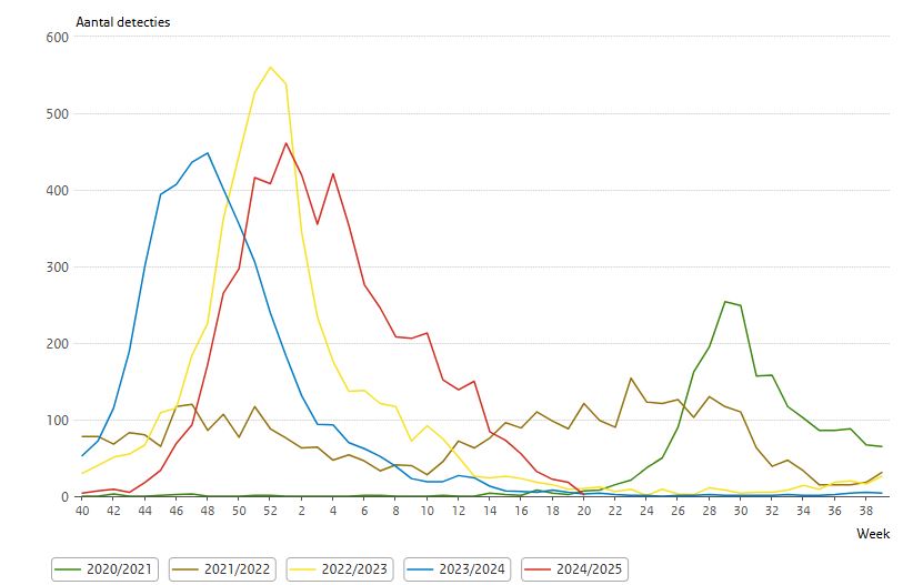 NB Tijdens de respiratoire jaren 2020/2021 en 2021/2022 was het detectiepatroon vanwege de coronapandemie anders dan andere jaren.