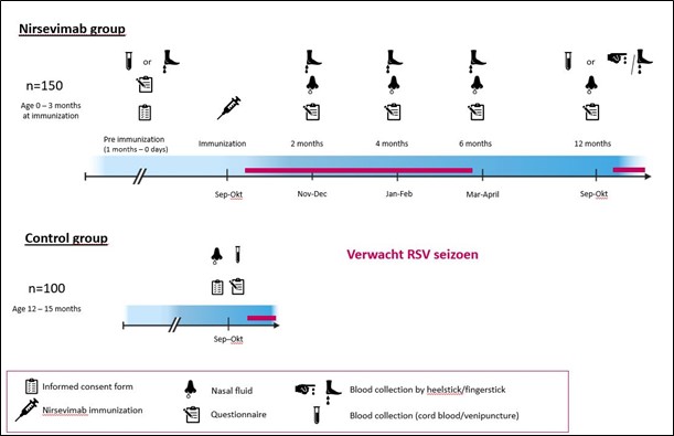 Bloedafname gebeurt via navelstrengbloed of een hielprikje vóór de RSV-immunisatie en maximaal vier keer via een hielprikje na de immunisatie. Optioneel is er twaalf maanden na de RSV-immunisatie een eenmalige venapunctie in plaats van hielprikje. De controlegroep bestaat uit kinderen die in oktober 2025 12-15 maanden oud zijn. Het RIVM benadert ouders van deze kinderen via een brief en flyer met de vraag om één vragenlijst in te vullen en één keer bloed en neusvocht bij hun kind af te laten nemen. Figuur 3 visualiseert de opzet van de IRIS-studie.