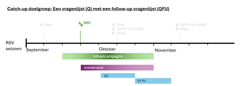 Baby’s die vlak voor of tijdens het RSV-seizoen worden geboren, krijgen zo kort mogelijk na de geboorte (binnen uiterlijk twee weken) de immunisatie aangeboden. Dit gaat om baby’s geboren van 1 oktober t/m 31 maart. - Jaarlijkse ‘catch-up’ immunisatie voorafgaand aan RSV-seizoen (catch-upgroep)