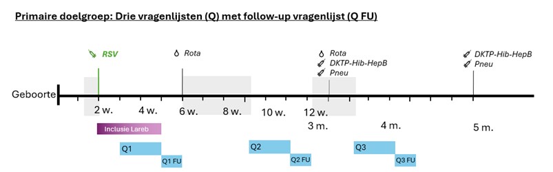 Bijwerkingencentrum Lareb (Landelijke Registratie Evaluatie Bijwerkingen ) is het meld- en kenniscentrum voor bijwerkingen van geneesmiddelen en vaccins en is verantwoordelijk voor het monitoren van mogelijke bijwerkingen van de RSV-immunisatie in Nederland. Naast de registratie van spontane meldingen door ouders en zorgprofessionals zet Lareb een observationeel onderzoek op (RVP monitor 2025) met online vragenlijsten. Dit onderzoek loopt van september 2025 tot en met juni 2027. Het onderzoek volgt kinderen over de tijd en brengt klachten na immunisatie tegen verschillende ziekteverwekkers in kaart (zie Figuur 4). Dit geeft inzicht in het bijwerkingenpatroon (type bijwerkingen, ernst, beloop, frequentie) en zorggebruik door klachten na immunisatie. Bovendien kunnen klachten die worden ervaren na verschillende vaccinatiemomenten binnen het RVP vergeleken worden. Dit geeft inzicht in de impact van een vaccinwijziging of -toevoeging binnen het RVP. De resultaten uit de onderzoeken worden gebruikt in de communicatie over deze immunisatie.