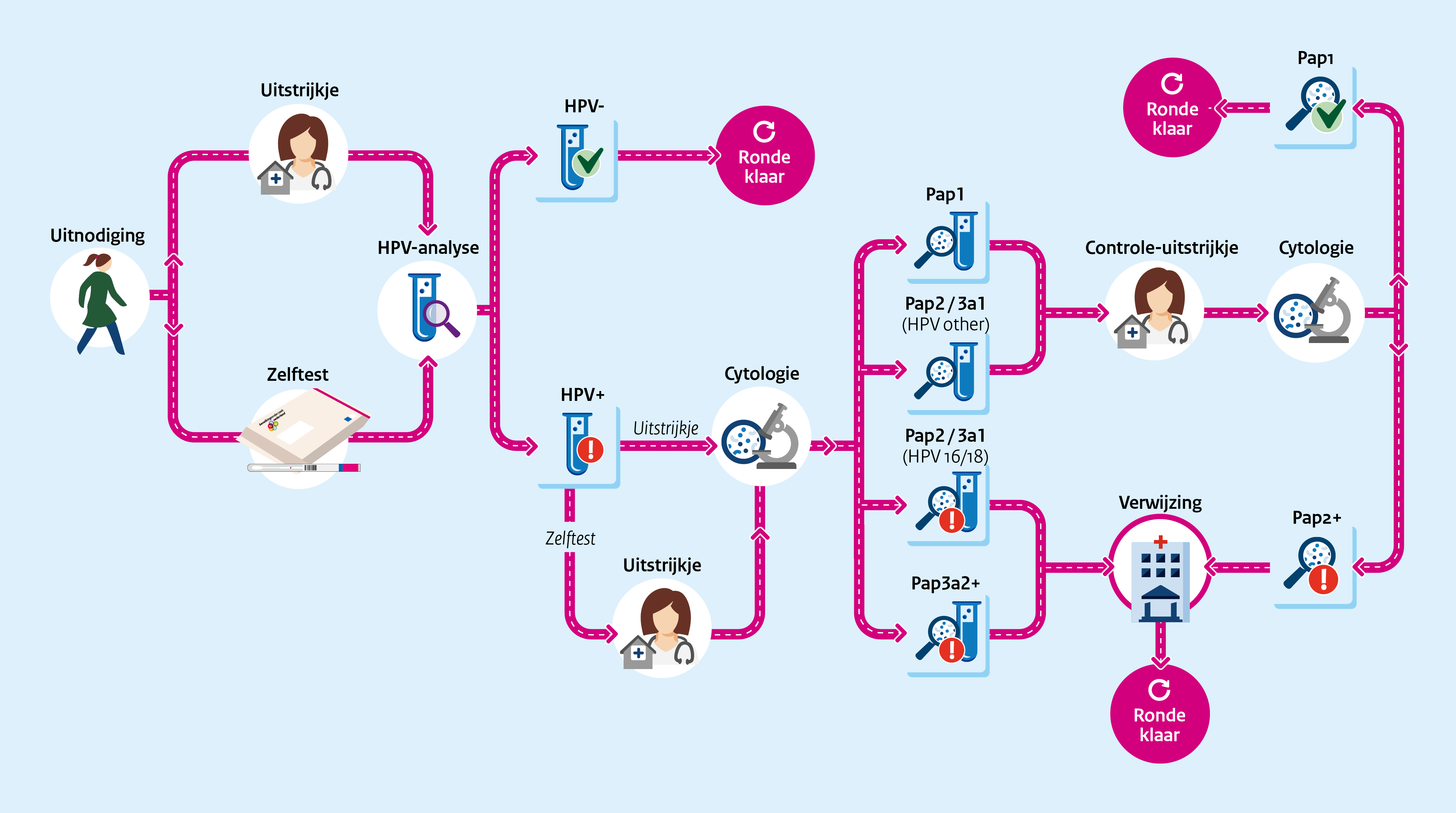 Onderstaand schema geeft het primair proces van het bevolkingsonderzoek baarmoederhalskanker weer.