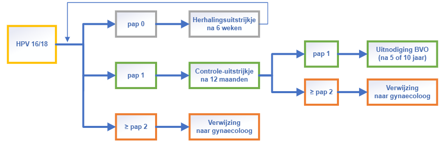 Deelnemers met HPV (humaan papillomavirus) 16/18 worden bij cytologische afwijkingen vanaf pap 2 (kleine celafwijkingen) direct doorverwezen. Wanneer er geen celafwijkingen zichtbaar zijn (pap 1), krijgen deze deelnemers na 12 maanden een uitnodiging voor een controle-uitstrijkje.