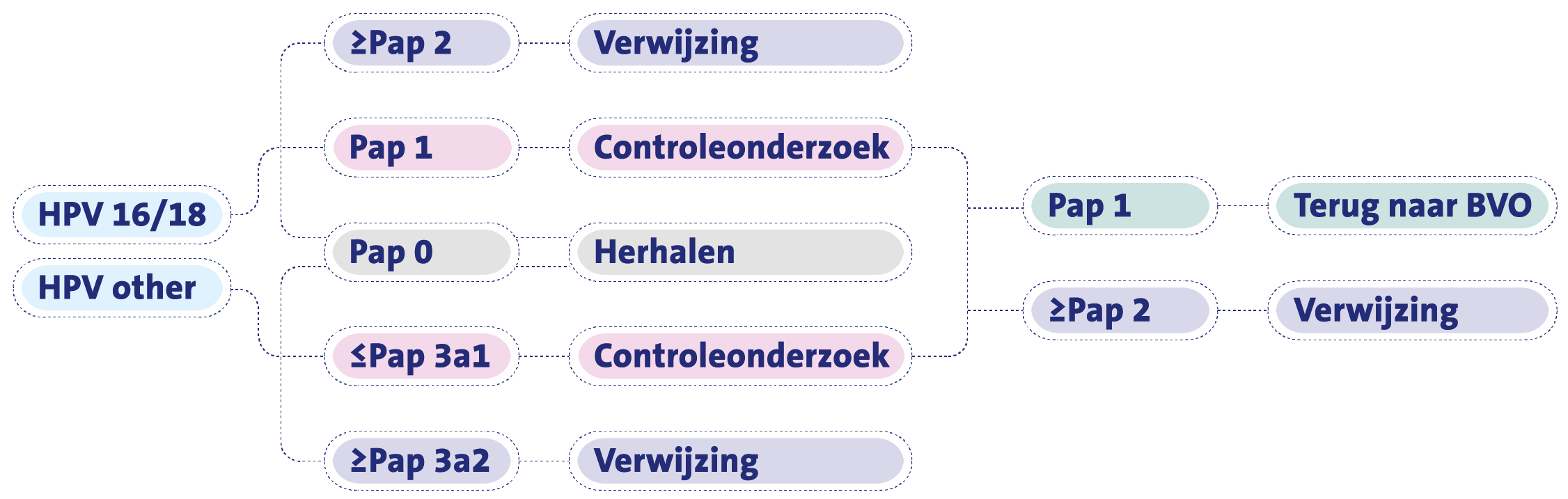 In de screening wordt een onderscheid gemaakt in 3 typen HPV (humaan papillomavirus): HPV16, HPV18 en de overige 12 hrHPV (hoog risico Humaan papillomavirus)-typen (HPVother). Naast een HPV-infectie met een enkelvoudig HPV-type, zijn ook dubbele en triple infecties mogelijk (co-infecties). Als binnen een co-infectie het type HPV16 of HPV18 wordt gedetecteerd, wordt het verwijsschema voor HPV16/18 gevolgd. Alleen bij een enkelvoudige infectie met HPVother, wordt het verwijsschema voor HPVother gehanteerd.