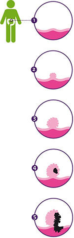 4. Een gevorderde poliep kan doorgroeien en onrustige cellen in zich hebben.