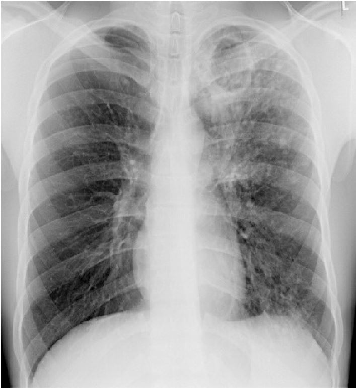 Figuur 1: Thoraxfoto met een typisch dikwandige holte (caverne) in de linker bovenkwab en verspreid over de linker long kleine haardjes