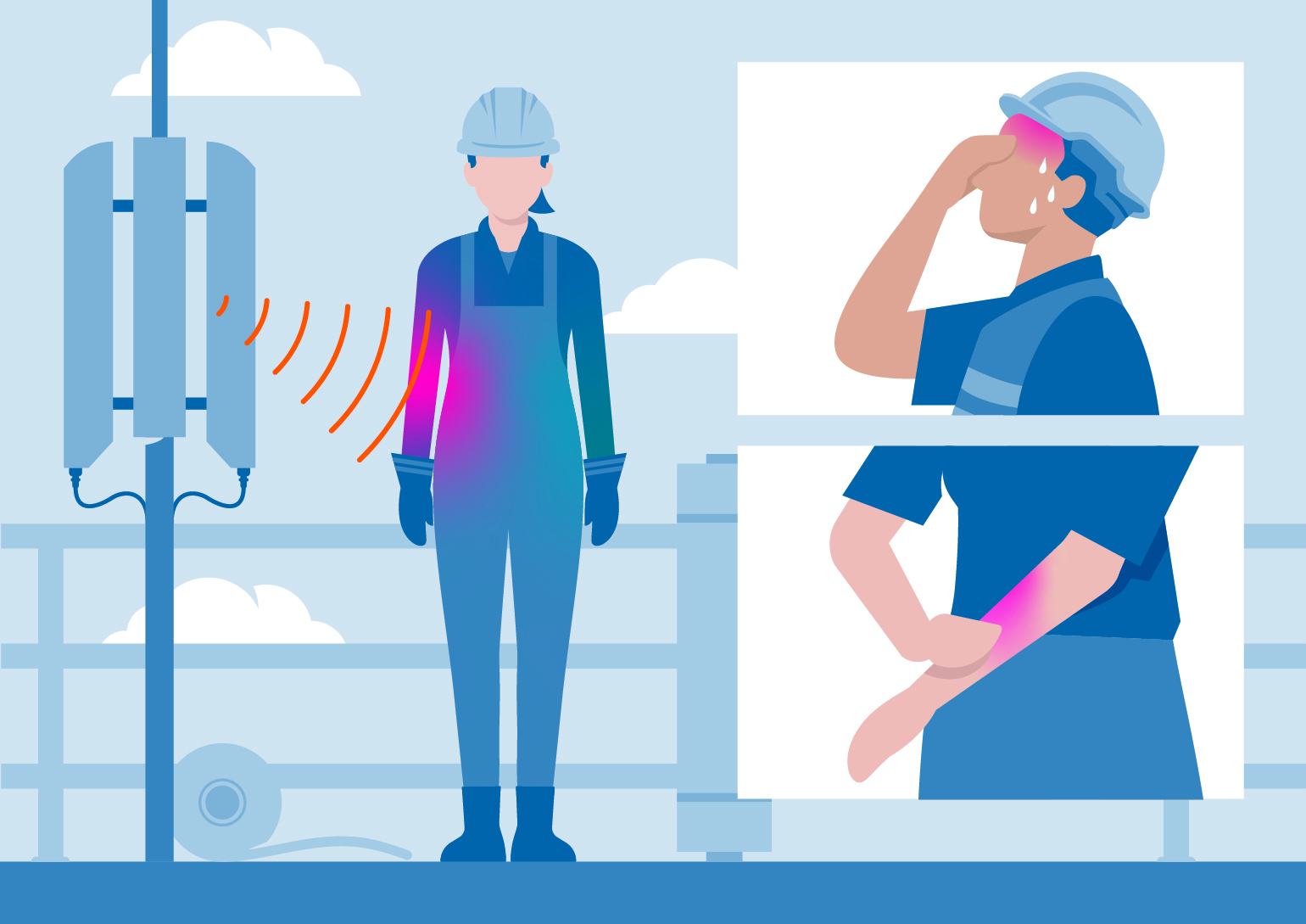 Arbeider naast een zendantenne, waaruit een bundel met elektromagnetische velden uitwaaiert.Daarnaast twee kleinere tekeningen van een arbeider met zweetdruppels en een arm met rode plekdoor verbranding.