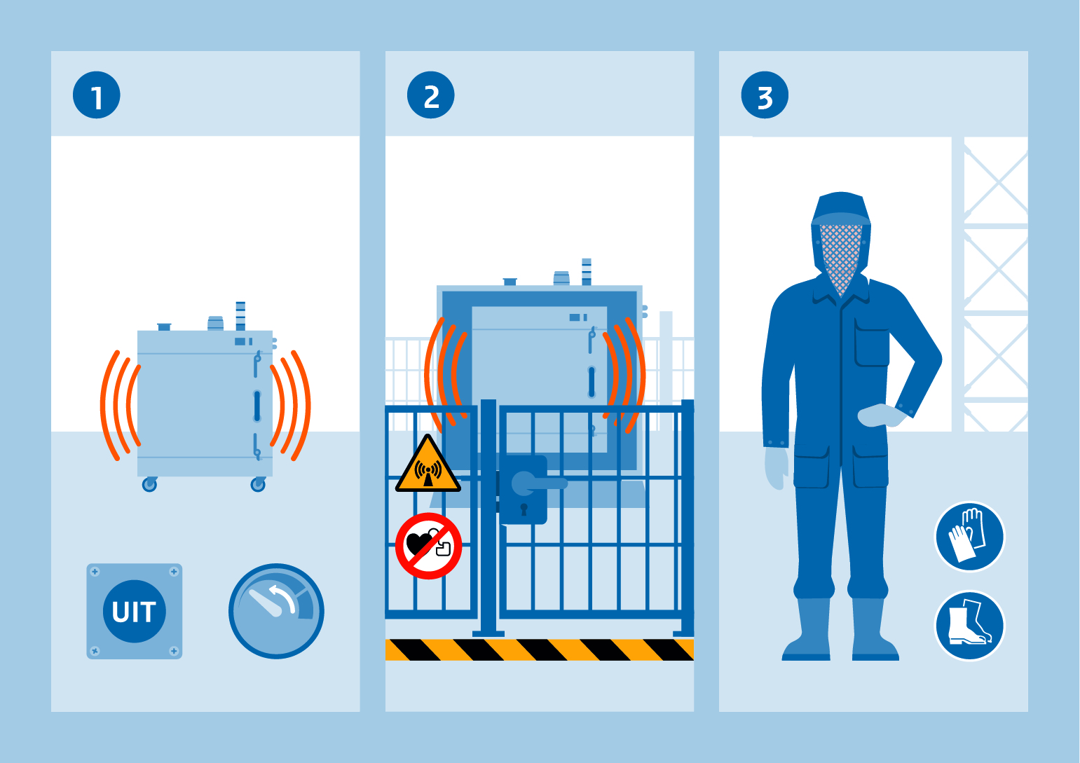 Drie plaatjes naast elkaar met van links naar rechts een oven met uit-knop en wijzerplaat, een ovenmet dikkere wand, hek ervoor en waarschuwingsborden en een arbeider in een beschermend pak.