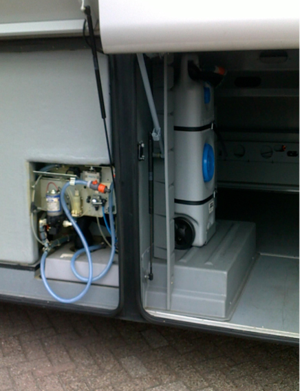 Figuur 2 De waterinstallatie van de bus met een schoonwatertank en een afvalwatertank