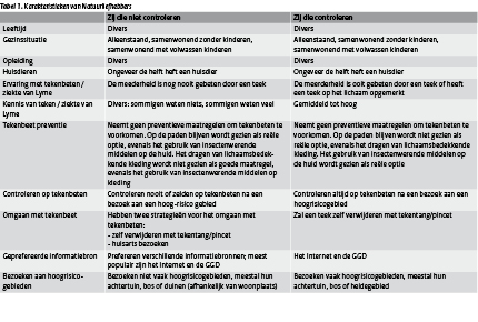 Tabel 1 toont de karakteristieken van de 2 groepen onder de natuurliefhebbers. De interviews suggereren dat ervaring met tekenbeten en/of de ziekte van Lyme de belangrijkste reden is voor een persoon om te gaan controleren.
