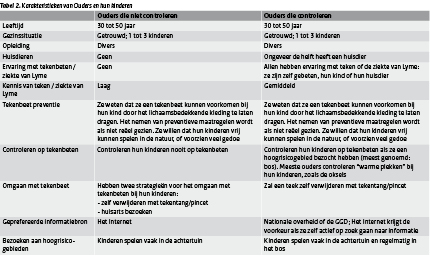 Tabel 2 toont dat het controleren op teken grotendeels wordt bepaald door eerdere ervaring met teken en de ziekte van Lyme: ouders hebben zelf met teken te maken gehad, één of meerdere kinderen waren tenminste één keer gebeten, een huisdier was eens gebeten, of ze kenden iemand met de ziekte van Lyme. Daarbij spelen kinderen van controlerende ouders meer in hoogrisicogebieden.