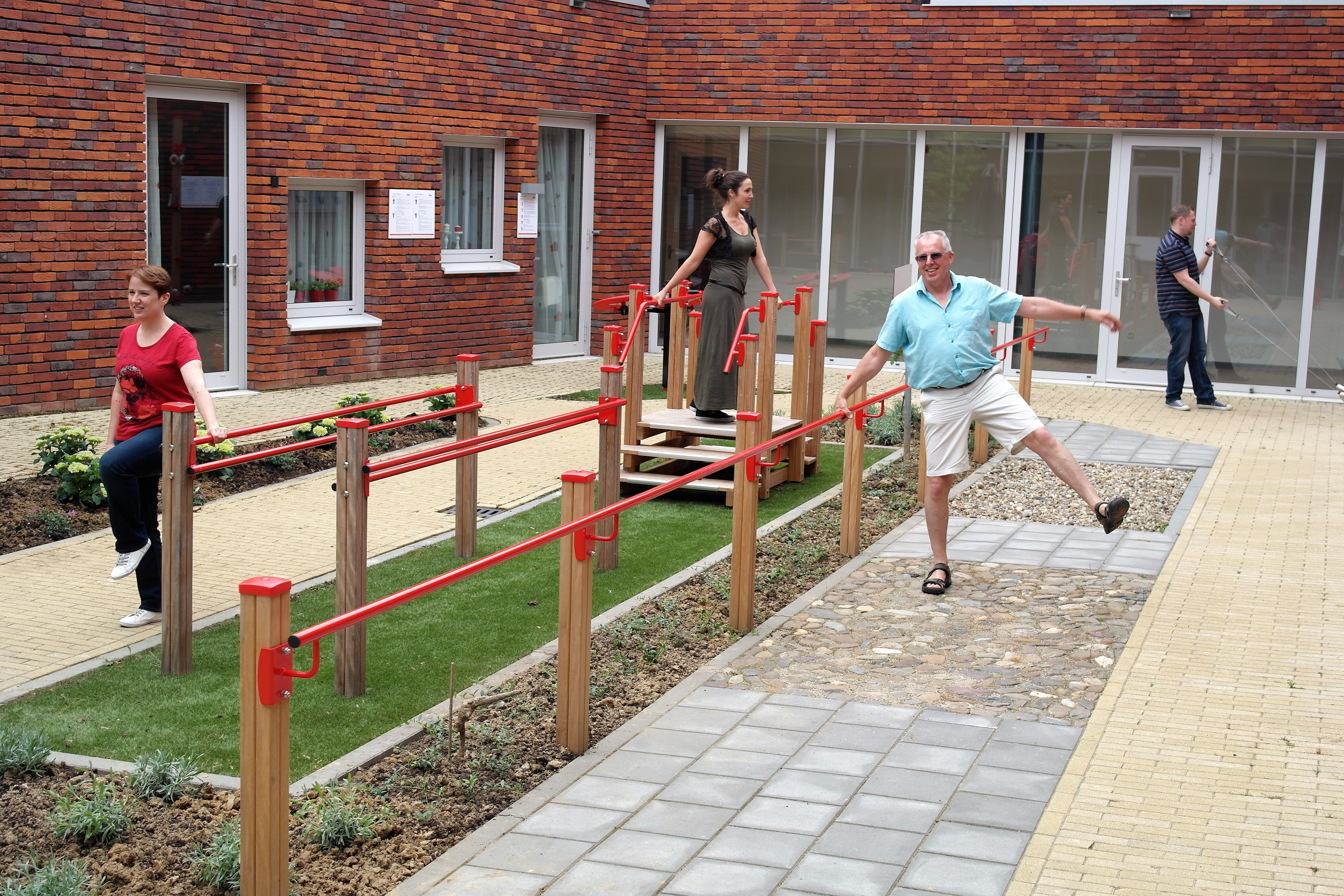 - Tussen het gebouw is een beweegtuin geplaatst met verschillende apparaten (o.a. fietsen, een loopbrug, touwen), waar patiënten zelfstandig gebruik van kunnen maken.