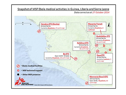 Artsen zonder Grenzen (alle verschillende zusterorganisaties samen) heeft inmiddels 263 internationale medewerkers gestuurd naar Liberia, Sierra Leone en Guinee, en heeft meer dan 3.000 medewerkers uit de landen zelf in dienst. Onder de internationale medewerkers bevinden zich ook Nederlanders. De Nederlandse tak van Artsen zonder Grenzen leidt inmiddels het project in Kailahun, Sierra Leone. Dit betekent dat er tot aan het einde van het jaar ongeveer 120 personen via Nederland naar Sierra Leone zullen reizen. Na hun werk zullen ze terugkeren in Nederland voor een debriefing en worden ze 21 dagen - de maximale incubatietijd van ebola - gevolgd. Een deel van deze medewerkers zal deze 21 dagen in Nederland doorbrengen, een ander deel zal naar hun eigen land teruggaan (Verenigde Staten, Canada, Verenigd Koninkrijk, India, etc.).