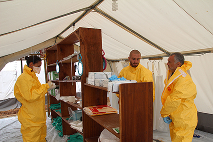 De behandelcentra voor ebola zijn dusdanig opgezet, dat er slechts in 1 richting wordt gewerkt (van laag naar hoog risico). Alles is erop ingericht om de medewerkers optimaal te beschermen. Voordat ze naar binnen gaan in het hoogrisico- gedeelte worden medewerkers in paren aangekleed in volledige beschermende pakken (PPE, personal protection equipment). Als duo betreden zij de hoogrisicozone, om daar gericht handelingen uit te voeren. De temperatuur in de volledig afsluitende pakken kan oplopen naar 40 graden. Vanwege die hitte en het risico oververmoeid te raken, mogen medewerkers slechts 1 uur in de hoogrisicozone werken. De paren houden elkaar voortdurend in de gaten. Mocht 1 van beiden moe of niet geconcentreerd ogen, dan gaan zij gezamenlijk weer naar buiten. De pakken van medewerkers die de hoogrisicozone verlaten, worden door andere medewerkers eerst gedesinfecteerd met chloor, waarna ze hun kleding, met behulp van een buddy, volgens een strikt protocol laag voor laag uitdoen. Alle PPE (Personal protective equipment), maar ook alles wat in de hoogrisicozone is geweest wordt uiterst zorgvuldig ontsmet of verbrand.