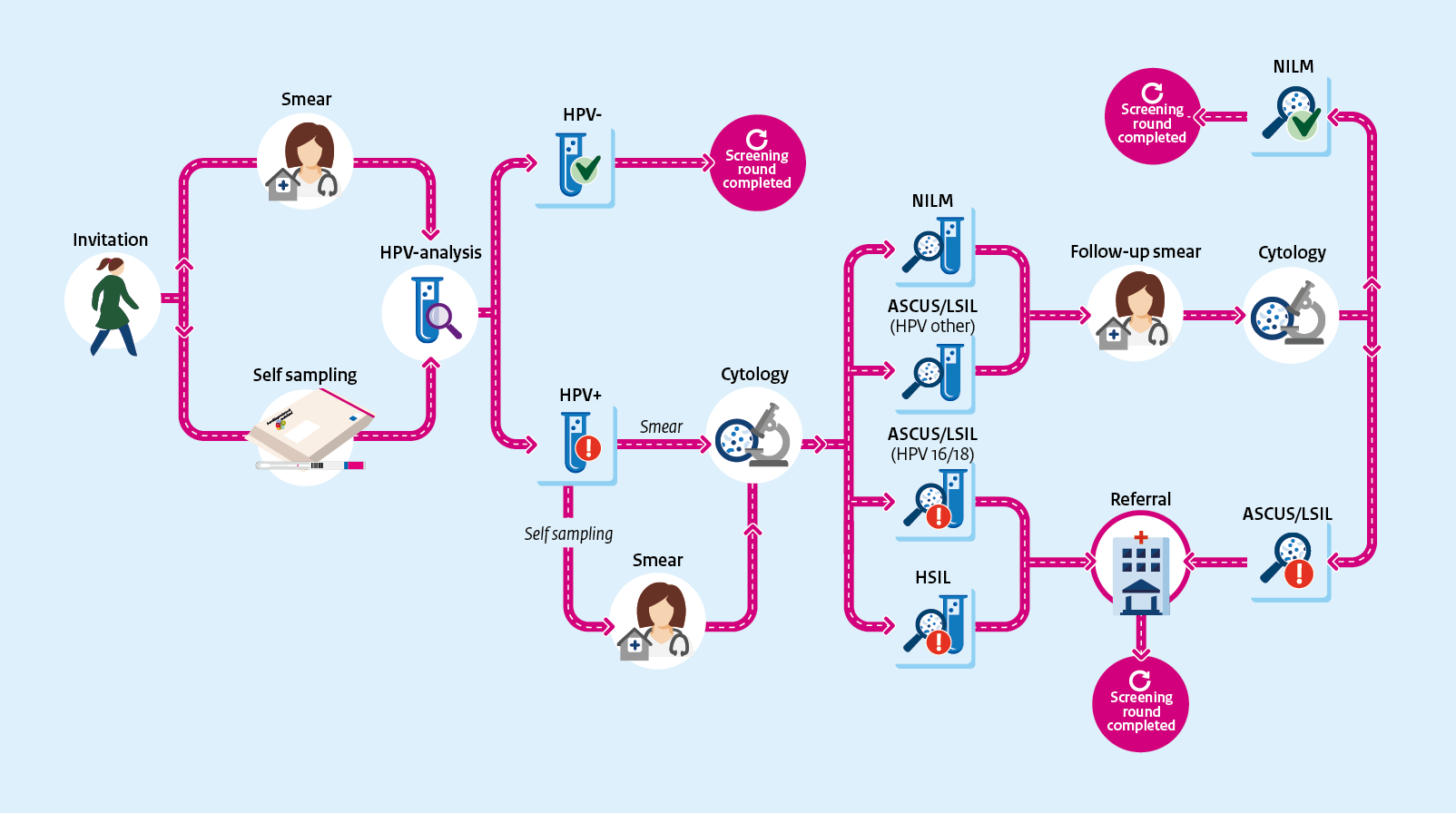 The cervical cancer screening starts with the selection of people who are eligible to be invited. The screening ends by informing the participants of the results. Participants who, based on the results, require further diagnosis and possibly treatment are referred to regular healthcare providers.