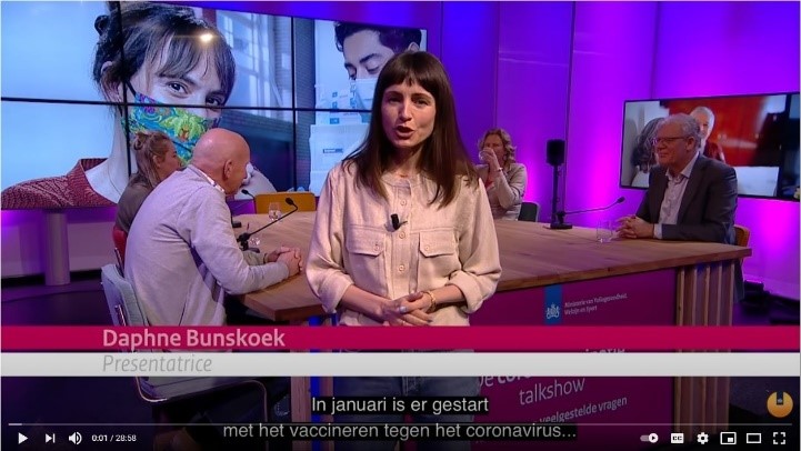The Ministry of Health, Welfare and Sport (VWS) commissioned a talk show in which a number of experts answer questions about COVID-19 vaccination. The panel includes a nurse and a person over 60. Daphne Bunskoek is the presenter. The talk show can be viewed on YouTube.