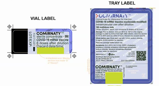 Pfizer/BioNtech has announced a change to the outer packaging and the label on the vaccine vial of the Comirnaty® vaccine. Until now, the labels have had a white border. With the change, the labels will have a purple border. The change will take place gradually over the next few weeks. The instructions for using the vaccine remain unchanged. This message is for information purposes only.