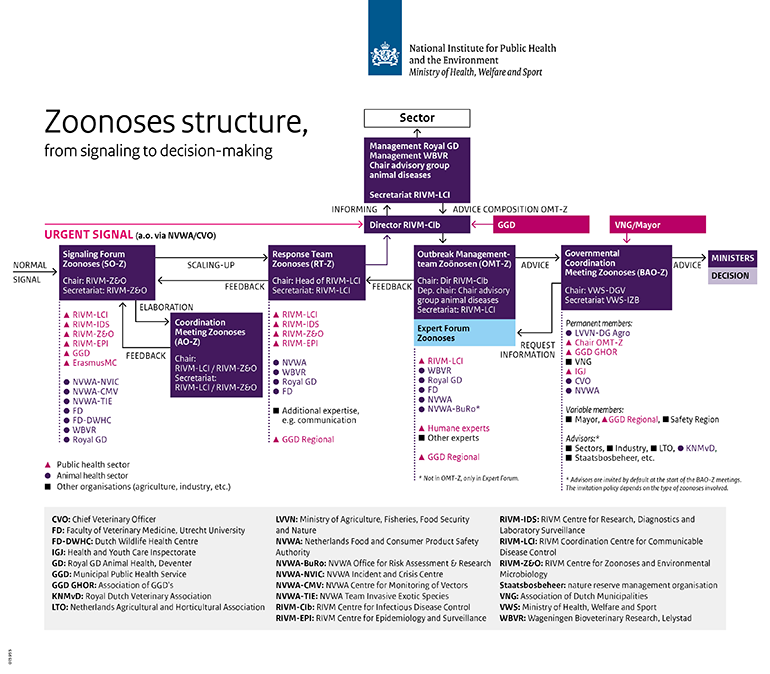 The aim of the Signalling Forum for Zoonoses is to signal and assess zoonotic infections in humans and animals that may pose a public health threat. Representatives from the human, veterinary health and wildlife domains share and assess these signals in a monthly meeting. In the event that a threat is identified that may potentially be urgent, additional meetings are scheduled as needed on an ad hoc basis and the head of the RIVM Centre for Infectious Disease Control is notified. Subsequent steps within the Zoonoses Structure are considered, wherever possible based on a risk assessment. Veterinary and medical health professionals are updated monthly in an e-mail outlining relevant signals.