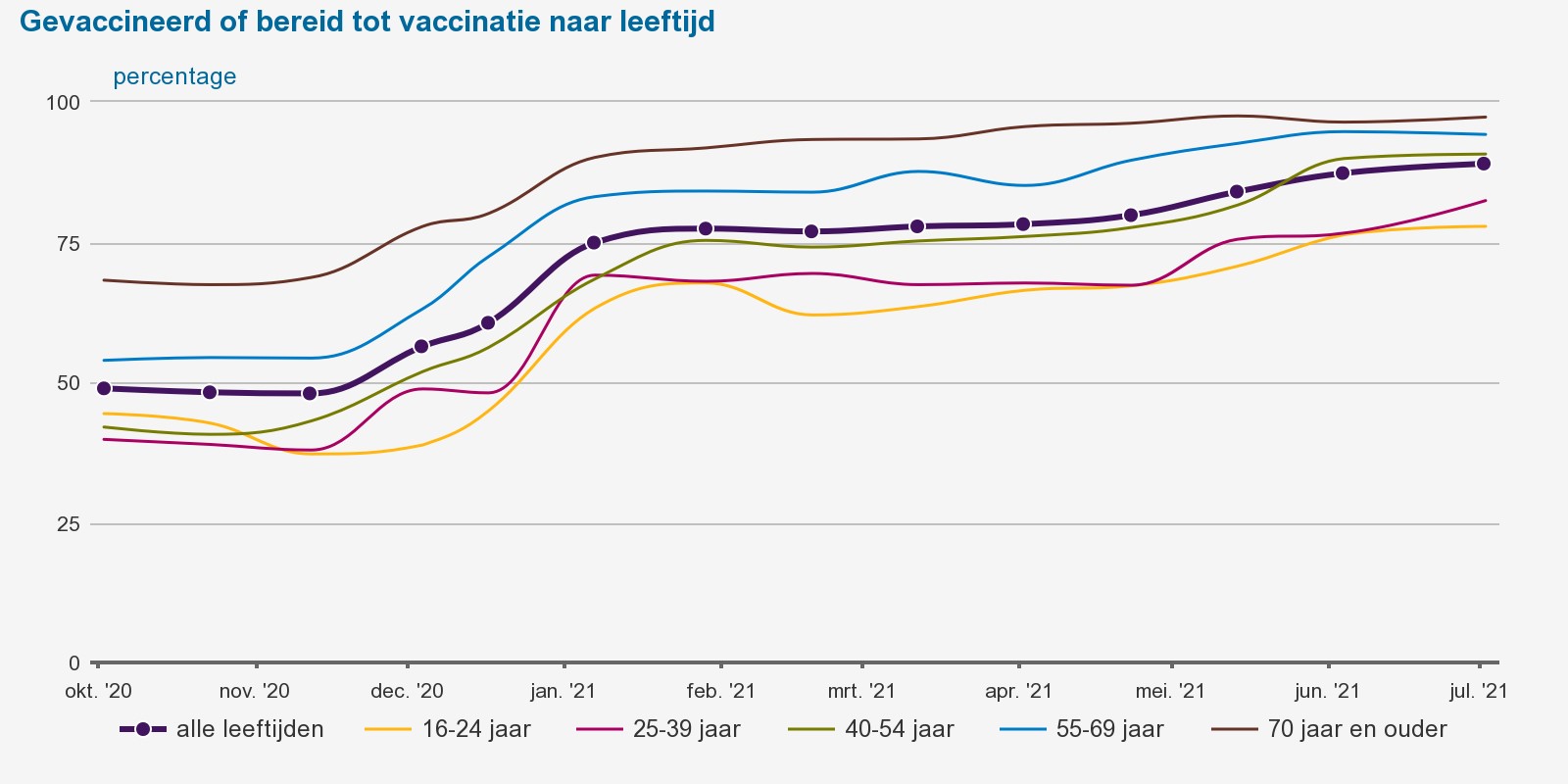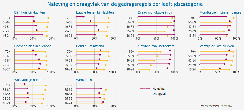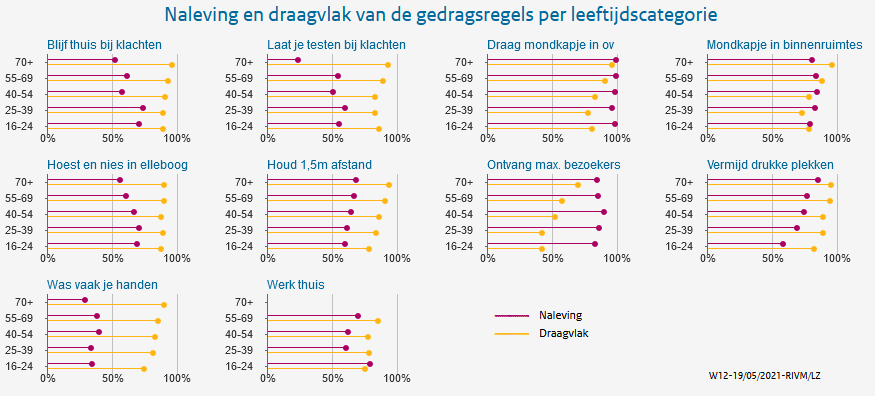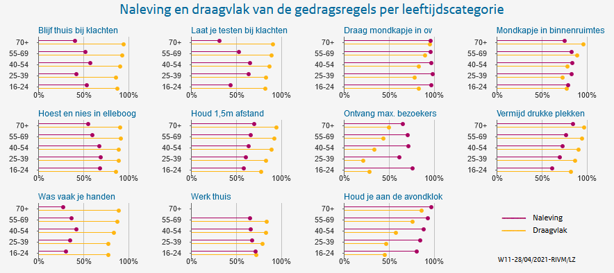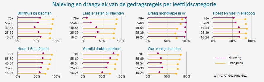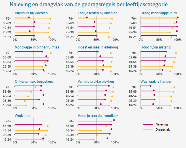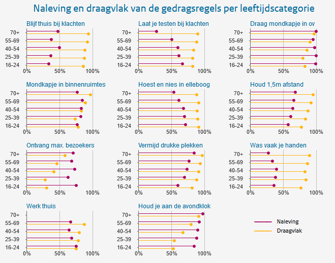 Het verschil in draagvlak tussen de leeftijdscategorieën is voor de gedragsregels: draag een mondkapje in publieke binnenruimtes en ontvang niet meer dan het maximum toegestane aantal bezoekers thuis het grootst; Voor de andere gedragsregels is de variatie in draagvlak tussen de verschillende leeftijdscategorieën minder.