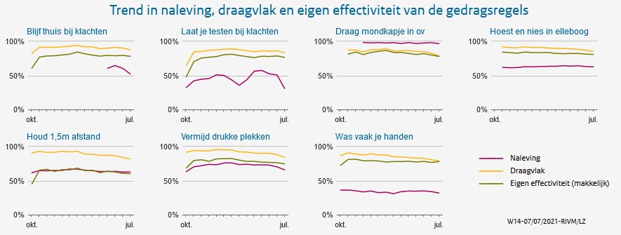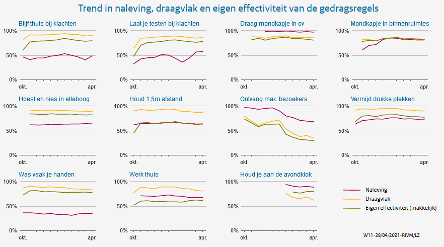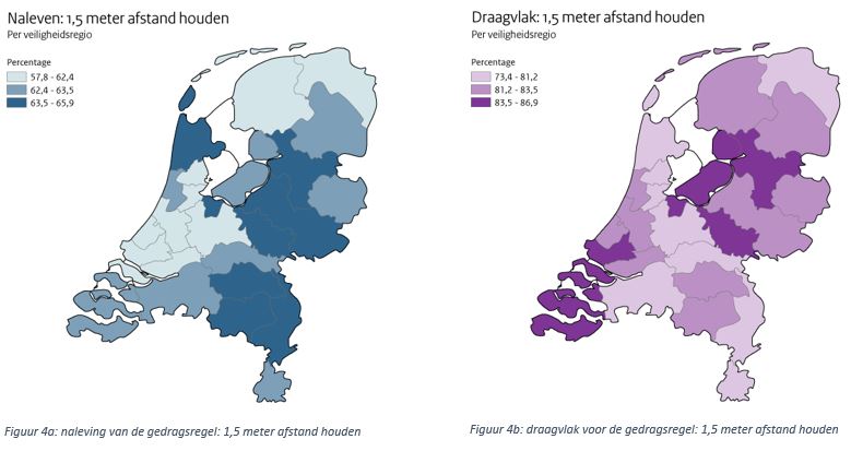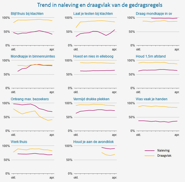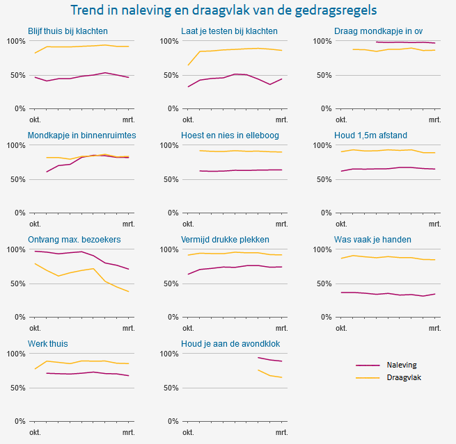 In de rechter figuur is te zien dat voor negen van de tien gedragsregels het draagvlak onder de bevolking minimaal 80% is. Er is één opvallende uitzondering en dat is het maximaal aantal mensen dat thuis op bezoek mag komen. Het draagvlak hiervoor is wel gestegen van 60,1% naar 64,8%. Dat kan mede veroorzaakt zijn door bovengenoemde versoepeling van maximaal 2 mensen thuis ontvangen naar 3 mensen thuis ontvangen.
