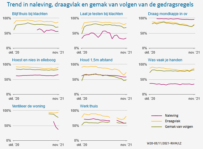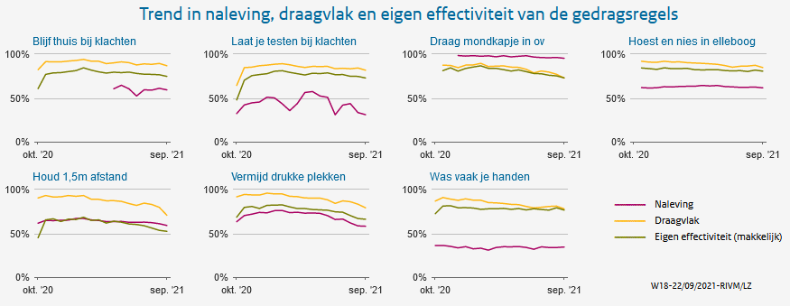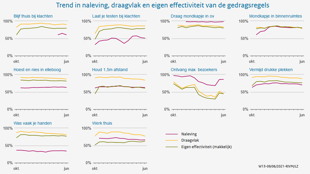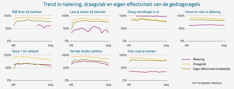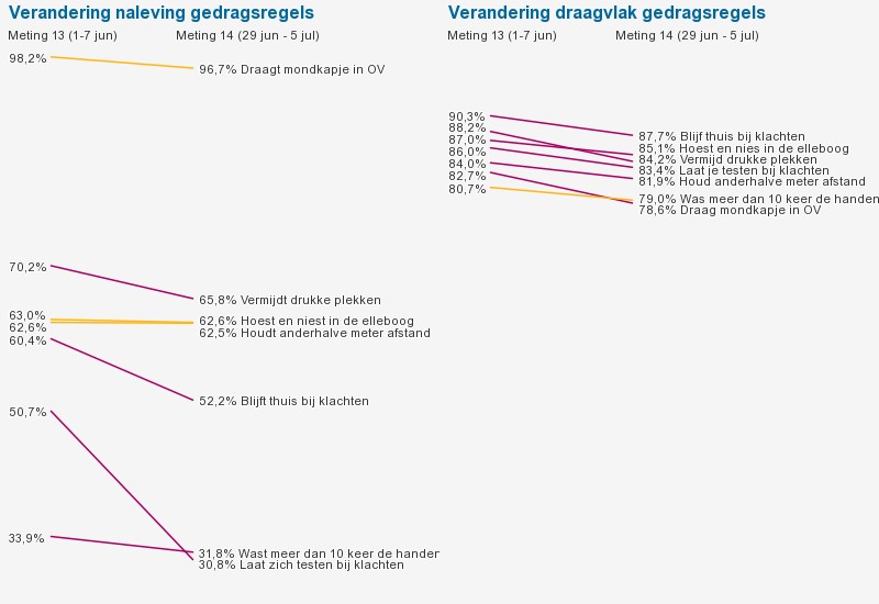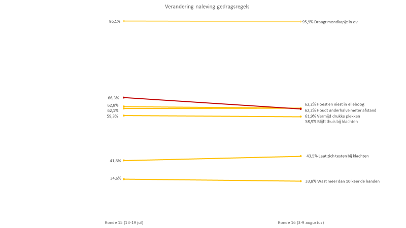 Van twee gedragsregels is de naleving significant afgenomen. Het aantal mensen dat op één dag niet meer dan twee bezoekers heeft ontvangen is gedaald met 6 procentpunt en vaak handen wassen is met 2,5 procentpunt gedaald.