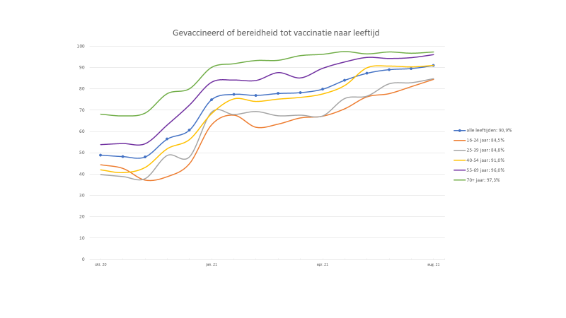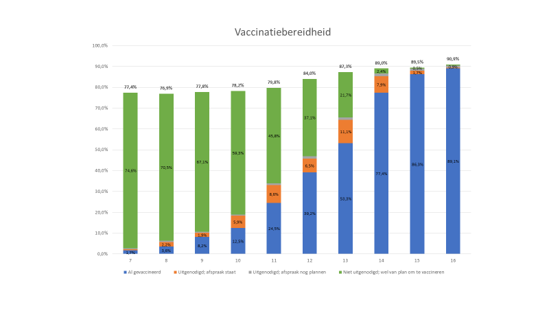 In het onderzoek meten we vaccinatiebereidheid van deelnemers voor de coronaprik. Belangrijk bij de interpretatie is dat vaccinatiebereidheid zich niet altijd vertaalt naar gedrag (i.e., daadwerkelijk de prik gaan halen). Praktische barrières, verzuimen in actie te komen, of ‘het vergeten’ kunnen redenen zijn dat mensen die aangeven wel een prik te willen halen dat uiteindelijk toch niet doen.
