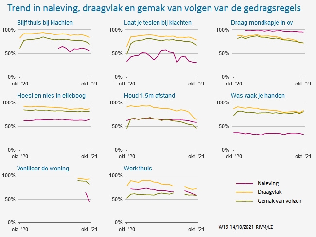 Ook de gedragsregels die gelden bij het hebben van klachten (namelijk je laten testen en thuisblijven) worden minder goed nageleefd.