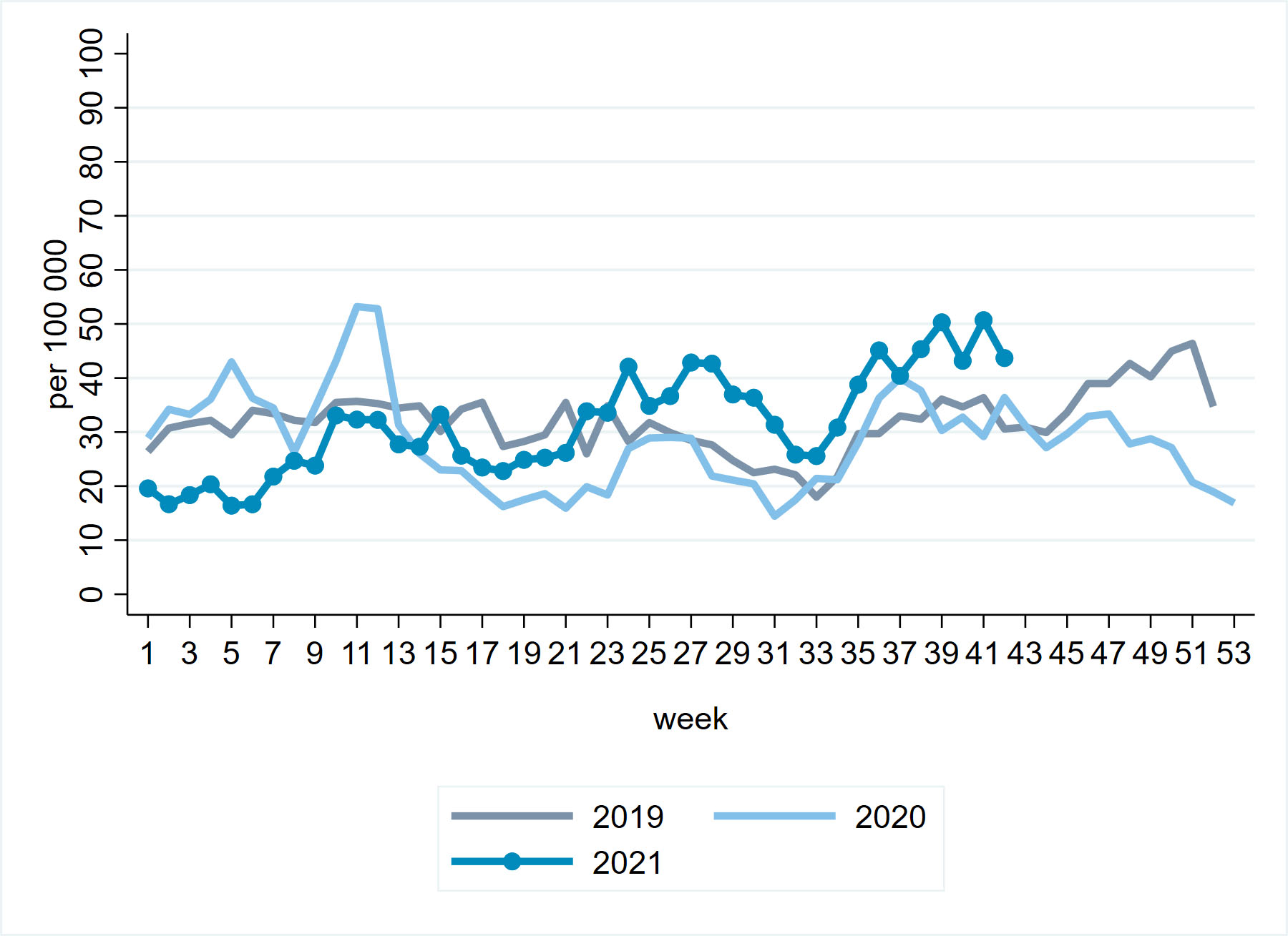 Sinds medio juni 2021 is het aantal wekelijkse huisartsbezoeken voor benauwdheid consistent hoger dan in de andere jaren. Sinds half augustus is er bovendien sprake van een stijgende trend. Aan het begin van de uitbraak (maart 2020) was er ook een korte piek.