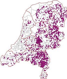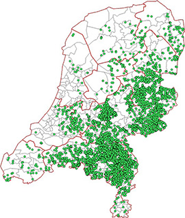 Onderstaande figuren zijn opgesteld op basis van de landbouwtelling 2017. Het betreft de locaties per diersoort (rundvee, pluimvee, geiten en varkensbedrijven). Met een minimale omvang zoals gedefinieerd in het VGO-onderzoek (250 stuks pluimvee, 50 geiten, 25 varkens,