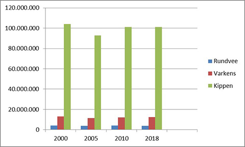 In Nederland bevinden zich gemiddeld ruim honderd miljoen kippen, twaalf miljoen varkens en bijna vier miljoen runderen (CBS, 2019). Het aantal schommelt enigszins sinds het jaar 2000. Dit is bij pluimvee vooral veroorzaakt door de uitbraak van de vogelgriep in 2003. Het aantal geiten en edelpelsdieren (nertsen) is sinds 2000 toegenomen, het aantal schapen afgenomen (zie Figuur Aantal dieren in Nederland vanaf het jaar 2000). Het aantal veehouderijbedrijven is afgenomen (zie Figuur 'Aantal veehouderijen in Nederland vanaf het jaar 2000'). Gemiddeld houden bedrijven dus meer dieren.