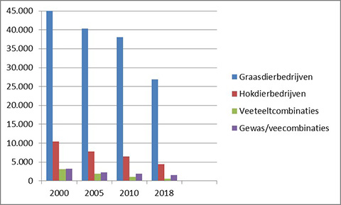 Figuur: Aantal veehouderijen in Nederland vanaf het jaar 2000. (Bron: Statline CBS, 2019)