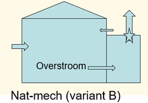 In een schoolgebouw met natuurlijke toevoer en mechanische afvoer van lucht wordt de gebruikte lucht afgevoerd door het ventilatiesysteem. Dat gebeurt door lucht via zogenaamde ventielen of afvoerroosters of via het systeemplafond door de TL buizen uit de ruimte te zuigen met behulp van een ventilator die altijd aan staat als het gebouw in gebruik is. De afvoervoorzieningen bevinden zich bij voorkeur in het lokaal zelf (Figuur, Type A), maar soms ook in de aangrenzende gang (Figuur, Type B). In dat laatste geval is er een overstroomvoorziening (bijv. een rooster en/of kier onder de deur of een constructie boven het plafond) nodig om ervoor te zorgen dat lucht vanuit het lokaal naar de gang kan stromen. De toevoer van verse lucht vindt plaats via gevelroosters, of door het op een kier openen van raampjes.