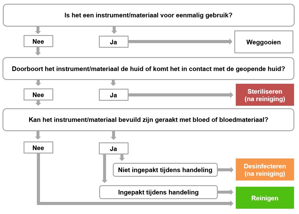 Er wordt niet ter plekke gesteriliseerd. Steriele materialen worden eenmalig gebruikt en daarna weggegooid of bewaard en meegenomen om elders te steriliseren.