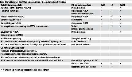 Patiënten moeten allerlei informatie hebben om participatie mogelijk te maken. Wij vonden verschillende items waar zij volgens experts iets over moeten weten. Daarnaast vonden we dat voor patiënten geldt dat de zorgverlener (huisarts, medisch specialist, apotheker, verpleegkundige) de belangrijkste bron van informatie is. Deze expert handelt en adviseert op basis van (nationale) richtlijnen. Om de patiënt correcte en gevalideerde informatie te kunnen geven, is het belangrijk dat de thema’s die voor patiënten van belang zijn ook in die nationale richtlijnen zijn opgenomen. Daarom hebben wij de items die uit de Delphi-studie naar voren kwamen vergeleken met bestaande nationale richtlijnen op het gebied van MRSA en antibioticagebruik. In deze vergelijking werden de MRSA-richtlijnen van de Landelijke Coördinatie Infectieziekten (LCI) en Werkgroep Infectiepreventie (WIP), en de antibioticagebruik richtlijn van de Stichting Werkgroep Antibioticabeleid (SWAB) opgenomen.