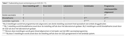 De belangrijkste verschillen tussen instellingen met betrekking tot de uitvoering van het vaccinatieprogramma betreffen de taakverdeling tussen de totale verslavingszorg en de GGD. Iedere instelling kent een andere taakverdeling aangaande vaccineren, bloedafname en registreren in het landelijke systeem. Tabel 1 toont een overzicht van deze taakverdeling.