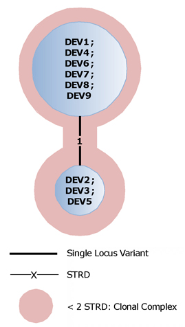 De laatste maanden zijn er meer meldingen van C. difficile PCR (polymerase chain reaction)-ribotype 027-geassoccieerde uitbraken in ziekenhuizen en verpleeghuizen, met name in de regio rondom Rotterdam. Er lijkt ook een verandering van het antibioticagevoeligheidspatroon te zijn; tot 2010 waren de stammen in Nederland gevoelig voor clindamycine, maar in 2011 lijkt het vooral om clindamycineresistente stammen te gaan. MLVA (Multi-Locus Variable number of tandem repeat Analysis)-typering van 9 C. difficile-stammen uit deze uitbraak toonde duidelijk dat er sprake is van 1 clonaal complex (zie figuur 1). Interessant is de bevinding dat de stammen verwant zijn aan de in 2011 gevonden C. difficile-PCR-ribotype 027 in de regio van Rotterdam. De bevinding dat C. difficile-PCR-ribotype 027 ook binnen verpleeghuizen uitbraken geeft is verontrustend omdat de mogelijkheden om uitbraken daar te bestrijden anders en mogelijk moeilijker zijn dan in ziekenhuizen. Het staafdiagram (figuur 2)laat het aantal C. difficile PCR-ribotype 027-stammen zien (geel) dat vanaf 2005 tot en met februari 2011 door het referentielaboratorium in Nederland werd gevonden.
