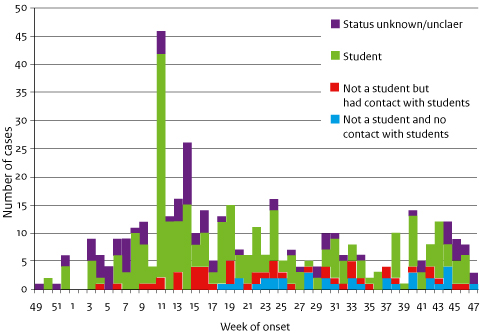 De bofepidemie is nog niet voorbij. Het aantal patiënten met een eerste ziektedag tussen 1 december 2009 en 3 november 2010 bedraagt nu 434. In Osiris worden door diverse GGD (Gemeentelijke Gezondheidsdienst)’en nog meldingen gedaan, waarbij 2 clusters opvallen. Ten eerste is er een cluster in Zuidoost-Brabant, met sinds week 40 in totaal 9 gemelde bofpatiënten die afkomstig zijn uit 2 aaneengesloten kleinere gemeenten. Besmetting heeft mogelijk plaatsgevonden in 1 café waar ze allen bezoeker van zijn geweest. Het tweede cluster komt uit Utrecht, waar sinds week 40 in totaal 17 patiënten zijn gemeld. Tien van de patiënten studeren en wonen op een campus van het University College. De GG&GD (geneeskundige gezondheidsdienst) Utrecht heeft vaccinatie aangeboden aan studenten die geen of maar 1 keer met BMR (bof, mazelen,rodehond) zijn gevaccineerd, maar tot nu toe is daar nauwelijks gebruik van gemaakt.