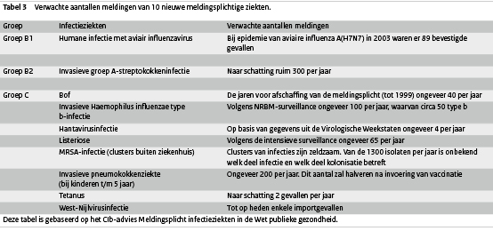 In dit advies werd tevens een schatting gemaakt van het aantal meldingen bij deze 10 nieuwe infectieziekten. Deze schatting is weergegeven in tabel 3. Uit onze analyse blijkt dat de gemelde aantallen redelijk overeenkomen met de verwachte aantallen uit het advies. Er zijn ook enkele (gedetailleerde) kanttekeningen na een volledig jaar meldingsplicht. Voor invasieve pneumokokkenziekte, listeriose en invasieve Hib-infectie geldt dat het opmerkelijk is dat er in 2009 bij het NRBM meer patiënten zijn gemeld dan er in Osiris geregistreerd staan. Het is niet duidelijk waardoor dit komt en of dit te maken heeft met de meldingsroutine. Ook blijkt dat in de praktijk dat de meldingsplicht van clusters van MRSA-infecties buiten het ziekenhuis in sommige situaties onduidelijk is.