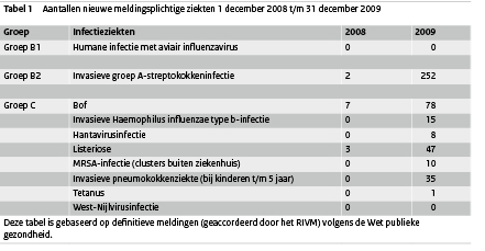In 2009 werden 2 clusters gemeld die waren terug te voeren op blootstelling in een ziekenhuis. Deze staan uiteraard niet in het overzicht, omdat deze niet meldingsplichtig zijn. Bij invasieve groep A-streptokokkeninfectie is onbekend in hoeveel gevallen profylaxe werd voorgeschreven aan gezinscontacten van de patiënt. Aangezien preventieve behandeling de reden was om de meldingplicht voor GAS in te voeren, zou het zinvol zijn om dit landelijk te monitoren en te evalueren. Een belangrijke gebeurtenis in 2009 was de pandemie van het nieuwe influenzavirus A(H1N1), waar ook Nederland mee te maken kreeg. De pandemie laat zien dat de Wet publieke gezondheid goed werkt bij dergelijke gebeurtenissen: voor het eerst heeft de centrale bevoegdheid om een nationaal bestrijdingsbeleid te voeren zijn toepassing gevonden. In hoofdstuk 2 worden de ontwikkelingen van de pandemie beschreven. Het eerste jaar meldingsplicht voor de tien nieuwe infectieziekten heeft waardevolle epidemiologische informatie over de betreffende ziekten opgeleverd. Voor de ziekten waartegen wordt gevaccineerd in het RVP, zoals de bof is de meldingsplicht nuttig voor het in kaart brengen van de vaccineffectiviteit en om waar nodig aanvullende maatregelen te kunnen nemen. Voor invasieve pneumokokkenziekte, listeriose en invasieve Hib-infectie zal de meldingsplicht nog moeten verbeteren.
