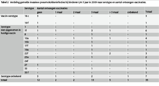 Invasieve pneumokokkenziekte is een ernstige infectieziekte die kan leiden tot levensbedreigende ziektebeelden zoals meningitis en sepsis. In 2006 is pneumokokkenvaccinatie opgenomen in het RVP. (14) Het huidige gebruikte vaccin beschermt tegen 7 van de 90 voorkomende typen (type 4, 6B, 9V, 14, 18C, 19F en 23F). Om mogelijk vaccinfalen te kunnen opsporen en een eventuele verschuiving van typen te monitoren, is invasieve pneumokokkeninfectie bij kinderen tot en met 5 jaar meldingsplichtig geworden. Van de 35 patiënten die in 2009 in Osiris gemeld zijn, waren er 28 in de leeftijdsgroep 0 - 2 jaar en 7 in de leeftijdsgroep 3 - 5 jaar (zie Tabel 2). Het ging om 16 jongens en 19 meisjes. In alle gevallen was ziekenhuisopname noodzakelijk en 2 patiënten (0 - 2 jarigen; beide volledig gevaccineerd) zijn overleden. Serotypering van de bacteriën liet een divers beeld van serotypen zien. In tabel 2 is een overzicht te zien van de verschillende serotypen en het aantal vaccinaties dat de patiënten hadden ontvangen. Voor pneumokokken geldt (net als bij invasieve Hib-infectie) dat het opmerkelijk is dat er in 2009 bij het NRBM meer patiënten met invasieve pneumokokkeninfectie werden gemeld dan er in Osiris geregistreerd staan (70 versus 35). Bij de patiënten die in Osiris bekend zijn en van wie het serotype bekend is, lijkt in geen van de gevallen sprake te zijn van vaccinfalen. De meeste pneumokokkeninfecties werden veroorzaakt door serotypen die niet opgenomen zijn in het huidige toegepaste vaccin en de kinderen die wel een infectie met een vaccinserotype opliepen waren ongevaccineerd.