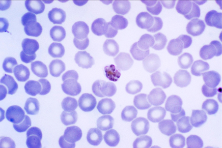 (plasmodium malariae-schizont in bloeduitstrijk (x1000) Foto: Centers for Disease Control and Prevention's Public Health Image Library #2715)