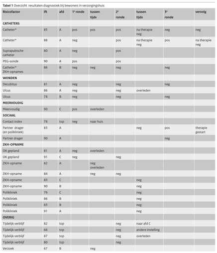 Gedurende ruim een half jaar werden de gevolgen van dit beleid gemonitord, waarbij tevens na 3 en na 6 maanden alle op dat moment aanwezige bewoners met een verhoogd risico op persisterend dragerschap gescreend werden. In totaal 27 bewoners werden één of meer malen gescreend (tabel 1).