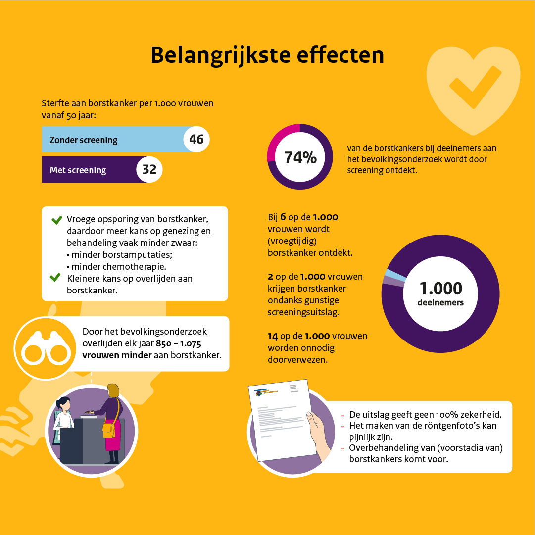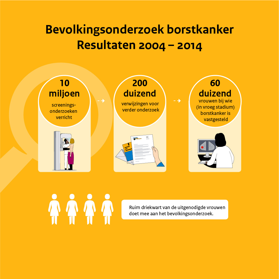 Op basis van het 14e evaluatierapport over het bevolkingsonderzoek borstkanker, is onderstaande infographic ontwikkeld. Hierin worden de belangrijkste resultaten van het bevolkingsonderzoek uit 2004-2014 weergegeven.