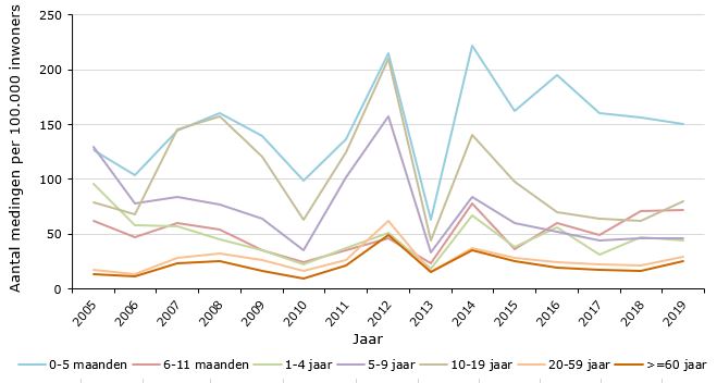 Figuur 2. Aantal meldingen van kinkhoest per 100.000 inwoners per leeftijdsgroep van 2005-2019.