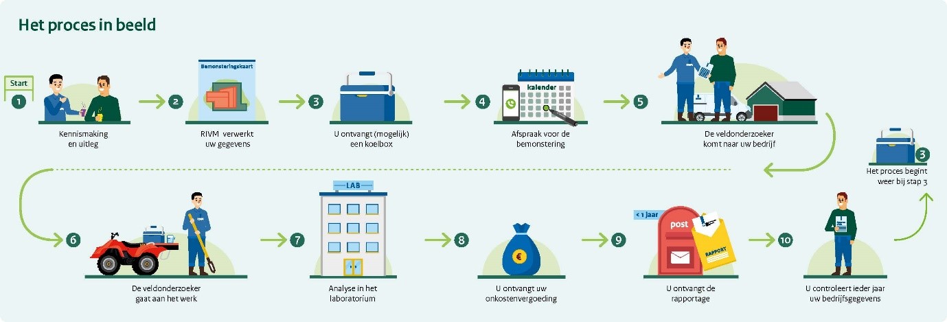 Voordat een nieuwe bemonsteringsronde start, ontvangt u een overzicht van uw bedrijfsgegevens zoals die bij het RIVM bekend zijn. Wij vragen u de gegevens te controleren en waar nodig te verbeteren en/of aan te vullen. Zo houden we de gegevens up-to-date en kunnen we de juiste percelen bemonsteren.