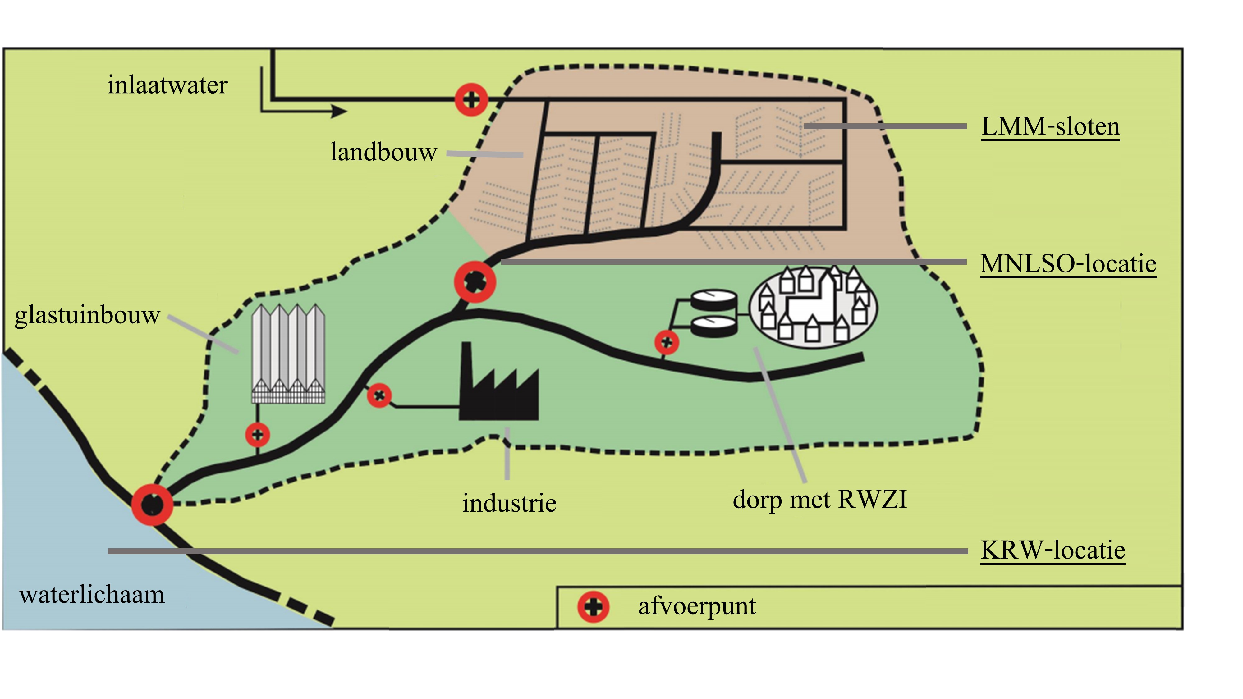 Figuur 1. Schematische weergave van landbouwsloten (LMM-sloten), landbouwspecifieke wateren (MNLSO-locatie) en de regionale KRW-waterlichamen (KRW-locatie) (aangepast uit Klein et al., 20162).