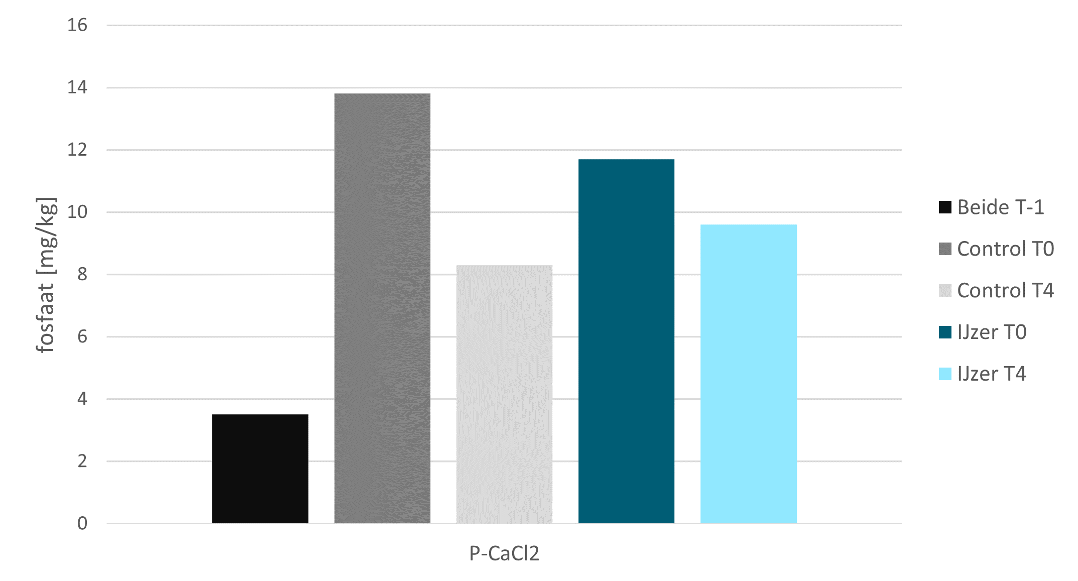 Daarnaast is initieel ook een hoge fosfaatgift gegeven (95 kg (kilogram) P2O5/ha) waardoor het P-PEA gehalte sterk opliep tot waardes boven de 10 mg/kg. Waarschijnlijk zijn deze fosfaatrijke condities de oorzaak dat er geen effecten van beregening met ijzerhoudend grondwater zijn waargenomen. Het voor de plant beschikbare fosfaat dat mogelijk tijdens de beregening met ijzerhoudend grondwater is vastgelegd wordt gedurende het experiment waarschijnlijk weer aangevuld uit het P-AL gehalte. De totale P-AL voorraad van de grondmonsters was veel groter dan vastgelegd kon worden door de ijzertoevoeging via beregening. De P-AL voorraad is niet in de modelberekeningen meegenomen. Dat verklaart het verschil tussen de modelresultaten en de kolomproef.