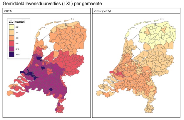 De onderstaande kaarten toont het berekende levensduurverlies per gemeente. De kaart links voor 2016. De kaart rechts toont het levensduurverlies in 2030 als al het vastgestelde luchtbeleid plus het SLA-beleid wordt uitgevoerd. De kaarten laten ook zien dat er verschillen zijn tussen gemeenten. Dat komt omdat de luchtverontreiniging in Nederland niet overal hetzelfde is.