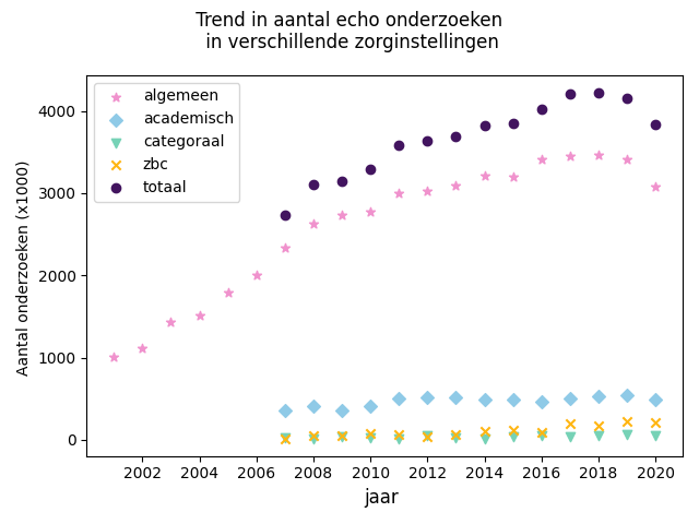 Figuur 4 toont de jaarlijkse trend in het aantal uitgevoerde onderzoeken, gebaseerd op de beschikbare gegevens. Het illustreert zowel de totale trend als de specifieke trends per modaliteit. Het is een interactieve grafiek waarin de verschillende modaliteiten kunnen worden in- en uitgeschakeld, terwijl het totaaloverzicht altijd zichtbaar blijft.