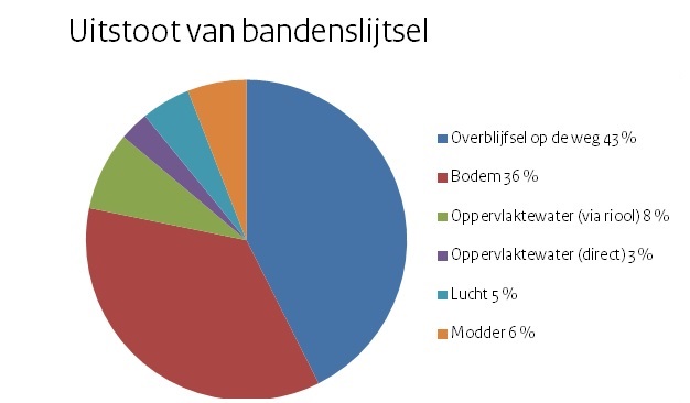 Uit onderzoek van het RIVM blijkt dat er in Nederland in 2012 zo’n 900 ton aan microplastics van bandenslijtsel naar de lucht werd uitgestoten. Dit is 5 procent van de totale uitstoot van bandenslijtsel, zie onderstaande figuur. De relatieve bijdrage van bandenslijtage aan de totale hoeveelheid plastic die in onze oceanen terechtkomt, wordt geschat op 5 tot 10 procent.